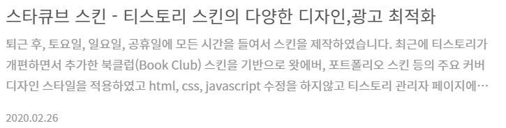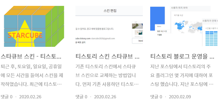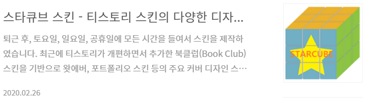 | 티스토리 스킨, 스타큐브 스킨 설치하기 (7) | 2020.02.26 |