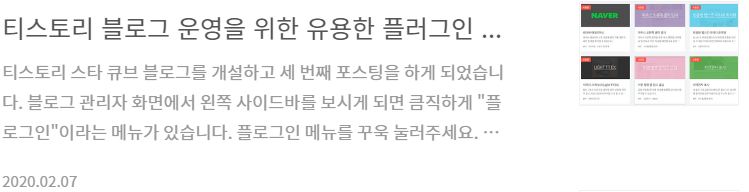 제목 위에 썸네일 이미지가 위치하며 이미지 사이즈는 230px x 300px 사이즈로 출력되며 티스토리 썸네일 이미지는 "C230x300"을 사용합니다.