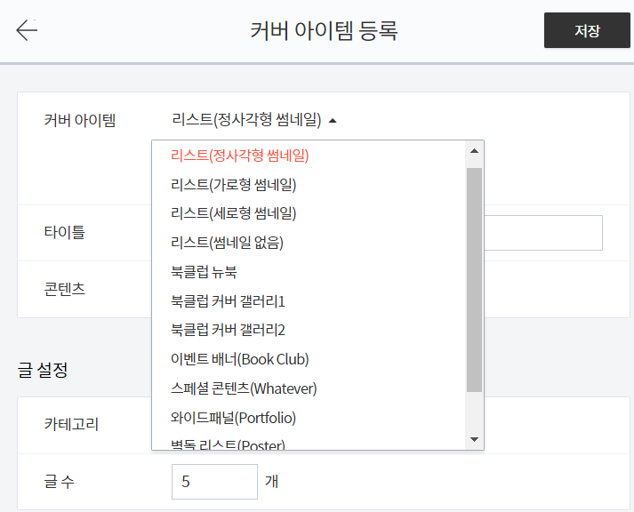 "+커버 아이템 추가"를 클릭하여 사용하고자 하는 커버를 선택하면 됩니다