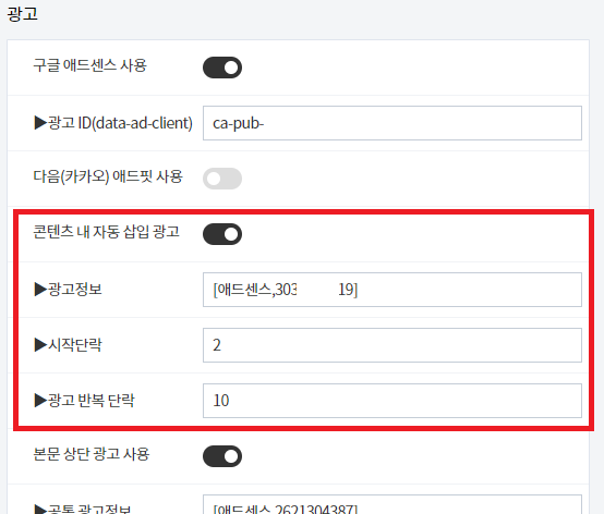 (애드센스의 자동 광고 삽입 기능과 유사함, 이 기능을 사용하면 본문 내에 좀 더 많은 광고를 삽입 가능)